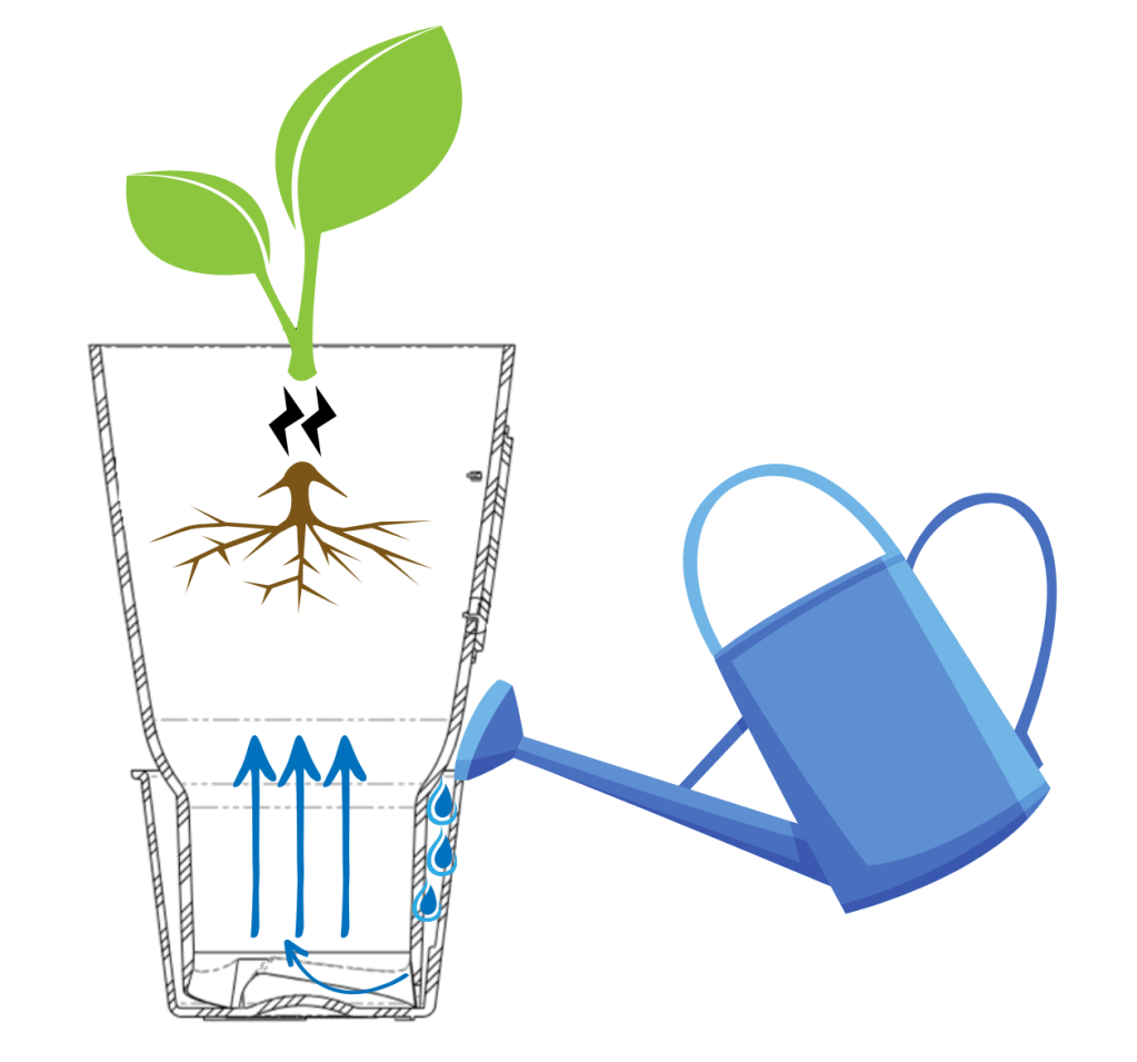With Upotic, you can place water in the bottom cup and your plant’s roots are situated well above. The soil itself will wick water up to the roots. They can drink when they are ready, without drowning!
